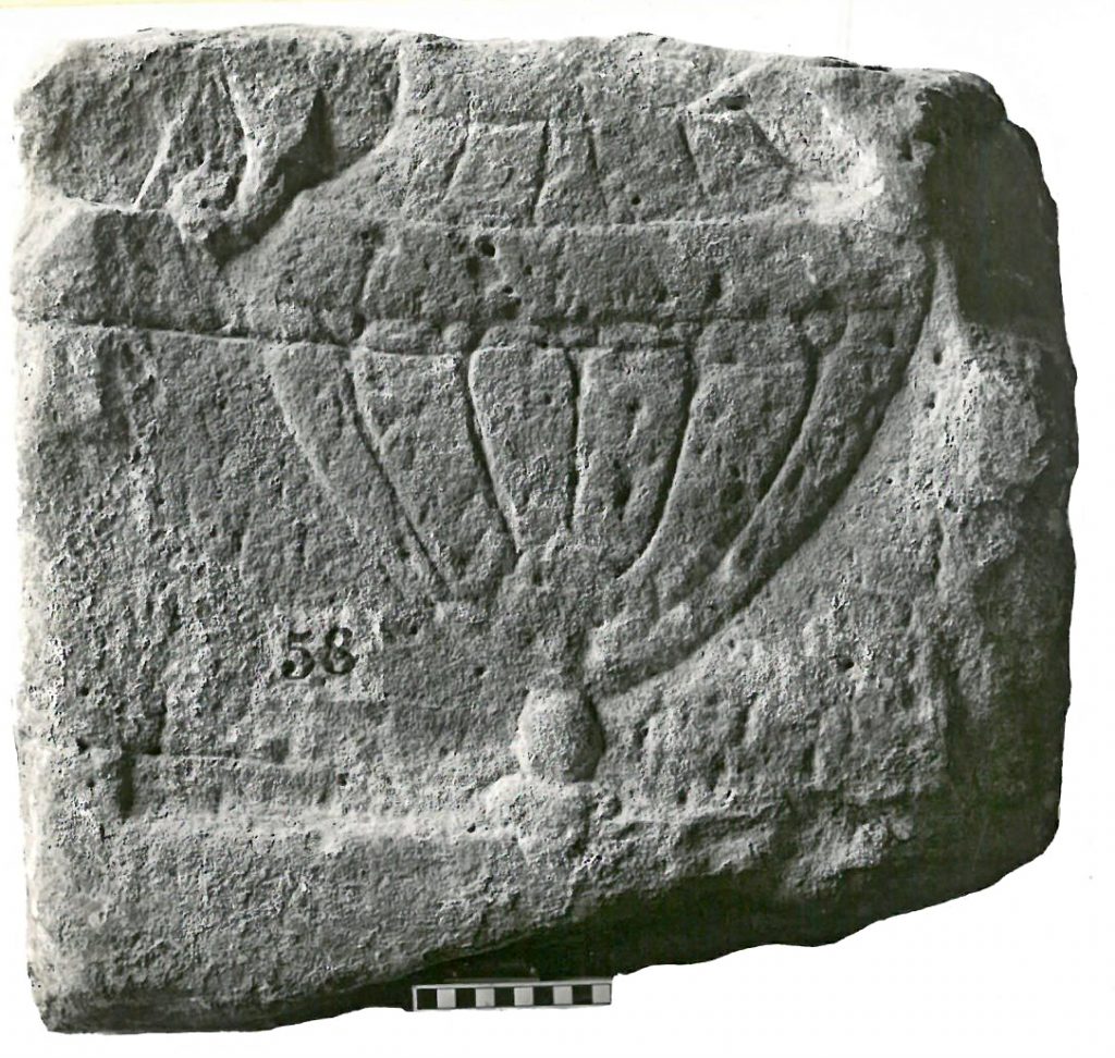 Der Reliefstein zeigt auf beiden Seiten eine breitbauchige Vase mit Doppelhenkel und schmalem Fuß und senkrechten Riefen an Hals und Bauch.