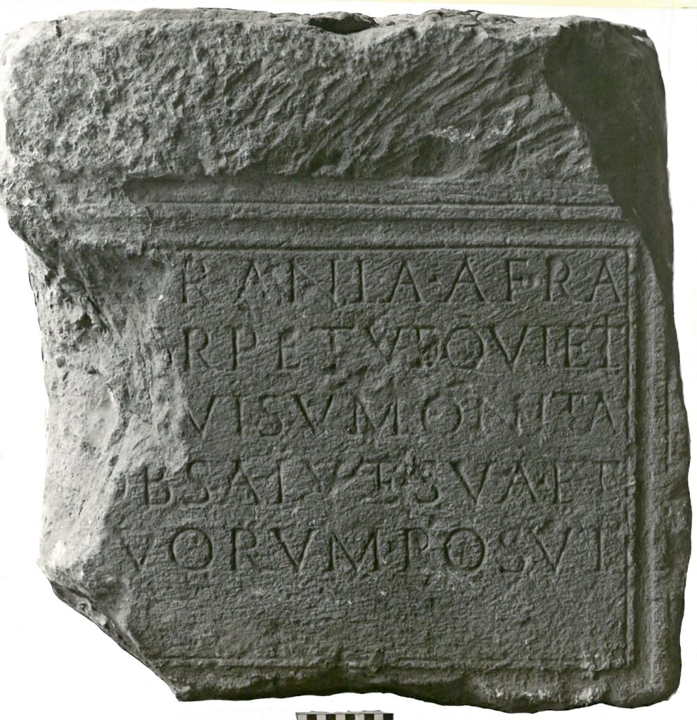 Die Inschrift ist mit Ausnahme der Zeilenanfänge noch gut erhalten. Danach hat die wegen eines Traums um ihre ewige Ruhe beorgte Afrania Afra sich und ihren Angehörigen zum Frommen den Stein setzen lassen.